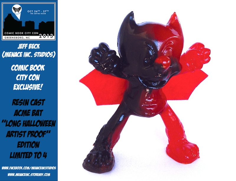 Joining the Comic Book City Con exclusives we posted a couple of weeks back, Jeff Beck of Menace Inc Studios is proud to reveal a super-limited run of artist proof Acme Bats! A collaboration with Acme Studios, the piece has been inspired directly by the company’s very own Bat mascot, with digital sculpting duties handed to the more than capable hands of Playful Gorilla’s Alexis Rivera. 3D printed, retooled and cast by Beck, the 4″ tall figures will be debuting at the Acme CBCC booth in the previously posted 3 exclusive colourways, whilst an edition of just 4 artist proofs will be up for grabs via the Menace Inc table. Entitled “The Long Halloween”, these guys have been cast in a seasonal marbled clear black/orange, coming in at $30 a piece… Here’s hoping at least a couple make it to the online store after the con next week!