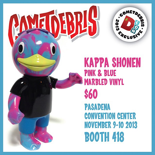 Comet Debris are the latest to reveal their Designer Con wares, coming with a stunning Kappa Shonen exclusive! Cast in a glorious marble pink and blue swirl (with no 2 alike), the 4″ tall soft vinyl figure comes painted in a mix of tightly masked black, blue, white and yellow sprays. Priced at just $60 each, Kappa Shonen will be up for grabs in limited numbers at booth #418… Here’s hoping for some blank versions in the Comet Debris store soon after!