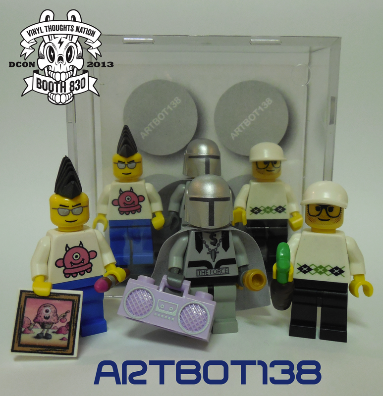 Infamous Lego/art toy crossover artist Artbot138 proudly presents the first of many offerings he’ll have up for grabs at Designer Con next week, the Legends of Vinyl (Set 1) custom 3 pack! Paying tribute to some of the biggest players in the art toy scene right now, this first set features 3 artists; Buff Monster, Sucklord and Scott Tolleson, all coming complete with trademark mowhawk/Boba mask/argyle (most of which has been custom printed), plus a whole range of likely accessories! Packed in a nifty see-thru Lego display case, the trio will be touching down at the Vinyl Thoughts Nation booth (#830) for an undisclosed sum. Stay tuned for more from the artist later in the week…