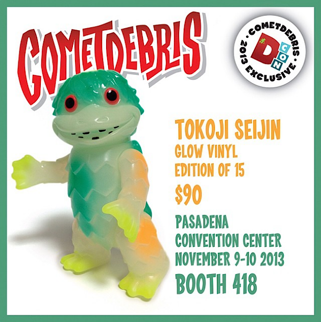Joining new versions of both Ace Robo and Kappa Shonen, Comet Debris is proud to present yet another figure exclusive making it’s way to Designer Con next weekend… Tokoji Seijin! Standing at around 6″ tall and featuring 5 points of articulation, the adorable beast has been cast in a GID soft vinyl this time around, replete with vintage-style neon sprays and hand painted features. Limited to an edition of 15, Tokoji Seijin will be up for grabs from booth #418 for just $90 a piece…