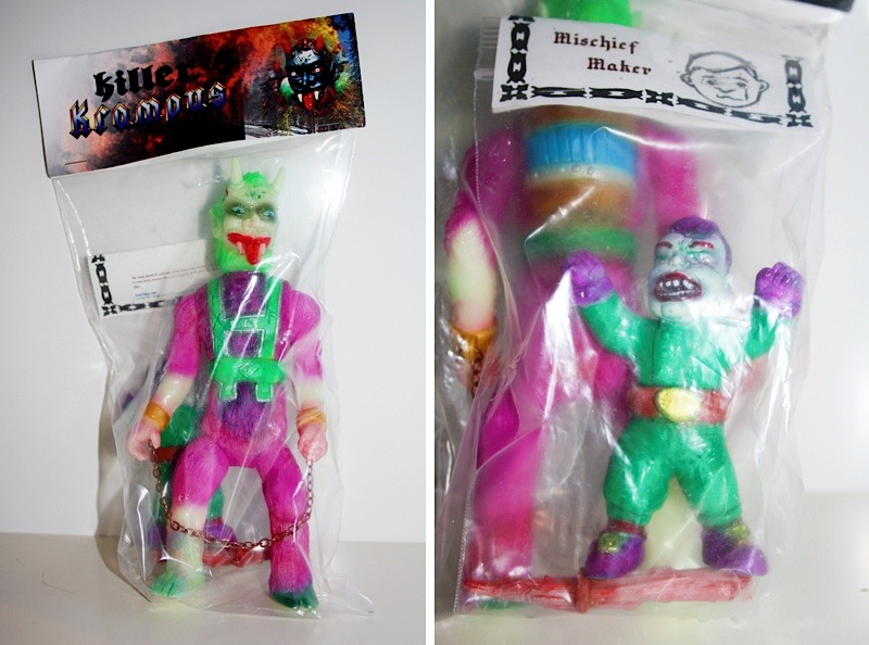 KaijuMonsteR have teamed up with Killer Krampus creator Mr Krotpong for an exclusive micro run of the figure! Limited to just 6 one-off hand paints, the 10″ tall figures have been cast in what appears to be a GID soft vinyl this time around, complete with 6 points of articulation, plus chains, beating sticks and a ‘naughty child’ accessory that can be split into 2 pieces and fitted in Krampus’ barrel backpack. Priced at $125 each plus shipping, all 6 can be found in the Kaiju MonsteR gallery store right here…