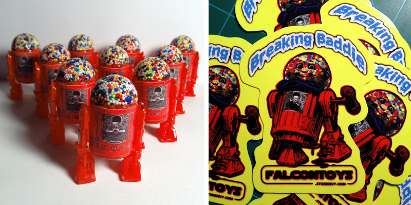 Previewed here earlier in the month, Mike Woods over at Falcon Toys has just revealed that the ingenious ‘Gumball’ Breaking Baddies will finally be up for grabs this week! Kit-bashed from a vintage R2D2 action figure, the hilarious boot has been recast in resin, featuring a gumball-red paint job, a coin turner/R2 mash-up chest decal, plus the piece de resistance… a clear cast dome head with miniature gumballs encased inside! Limited to an edition of 10, each coming packed with a GPK-style sticker, Gumball will be touching down in the Falcon Toys store this Wednesday, November 13th at 5pm Central time for just $35 a piece…