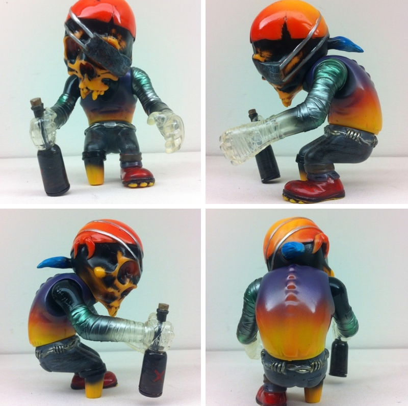 Fresh from a huge custom sale last week, Hellopike introduces yet another masterpiece into the Lunatic Fringe store… a Pushead x Secret Base Skull Pirate! Cast in a beautiful clear marbled soft vinyl, the artist has adorned the piece with eye catching sunset fades, metallic accents and meticulous hand painted detailing. Available alongside a number of Hellopike’s custom mini figure sets right here (at reduced prices, may we add!), the Skull Pirate can be yours for just $125 plus shipping…
