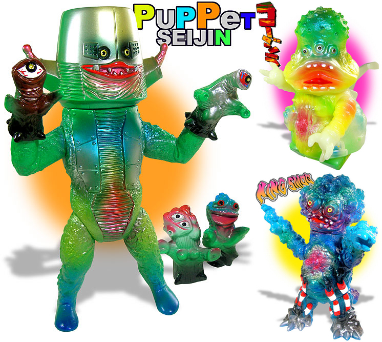 Regular like clockwork, Elegab has just revealed details for this month’s lottery sales! Featuring a GID Kouzira with Hawaiian-style sprays, a metallic accented “Cyan” King Smog and a stunning “Green” Puppet Seijin (complete with 4 interchangeable hand puppets!), the trio of 10″ tall sofubi have been priced at just 8,400yen (approx. $85) each plus shipping. Open until November 17th, anyone interested in taking part in the 3 lotteries can apply through the Elegab site right here… Good luck to all who enter!
