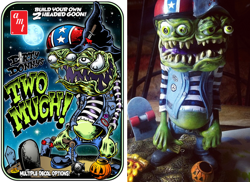 Inspired by the Odd Rods, Rat Fink and Car Kulture-styled monster models of the 60’s and 70’s, artist Dirty Donny has teamed up with Round 2 for the release of his very own garage-style resin figure, Two Much! Differing slightly from those vintage kits, Donny’s wonderfully realised piece actually manages to match the crazy box art(!), with the faithfully sculpted figure coming unpainted with a number of accessories, a display base and custom decal transfers designed by the artist himself. Releasing this Friday, November 22nd, Two Much will be available from a number of stores, including Monsters in Motion, for just $19.99 plus shipping…