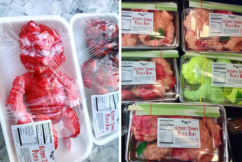 Hot off the heels of Topheroy’s awesome custom run, Jeremi Rimmel over at Miscreation Toys is proud to present the latest addition to the Autopsy Baby family… the deliciously grotesque Lunch Specials! Marking the first general release of the highly sought after “Zombie Staple” sofubi, two different versions will be up for grabs; the “Expired Meat Edition”, cast in a unique marbled red/white soft vinyl with an authentic meat packing tray and nutrition label, and the “Akachanmaki To Go Edition”, coming unassembled in a mix of marbled flesh, GID and pink with serving tray and chop sticks. Limited to just 8 of each, the figures will be touching down in the Miscreation Toys store this Monday, November 25th at 12pm PST for $125 each plus shipping…