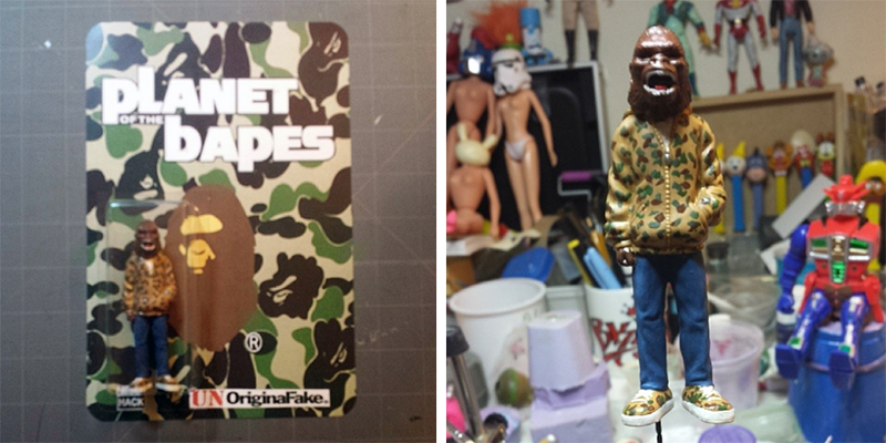 2bitHACK graces us with his latest figure just in time for Black Friday, the hilarious Planet of the Bapes custom bootleg! Kit-bashed from a variety of action figures and recast in resin, the dual homage to Planet of the Apes and Bathing Ape has been painted up in the Japanese clothing brand’s signature camo, complete with the obligatory matching kicks! Blister packed on a booted camo card back, the figure will be touching down in the 2bitHACK store this Friday (11/29) at Noon Pacific time for an estimated $45 plus shipping (TBC)…