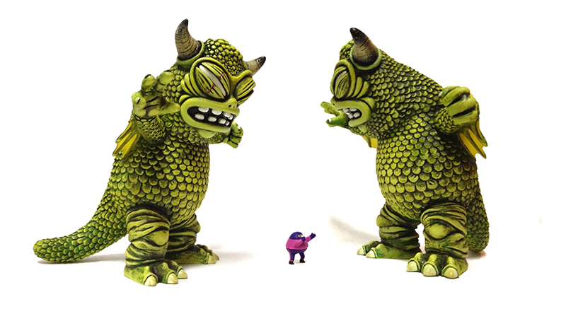Taking on the undeniably difficult task of customising one of his own sculpts, Chauskoskis is proud to present his latest piece… the Evil Greasebat! Building substantially upon the original Jeff Lamm-designed sofubi, the figure features a number of sculpted enhancements, including a new pair of eyelids that give him a badass look, a re-sculpted the neck area to give him a bigger and more fierce stance, new pair of hands, new set of translucent wings and a long tail- all in all, adding over 1000 new scales to the piece! Packed with a micro-sized version of the artist’s latest character “Kaiju Kira” (of which we’ve told we’ll be seeing more of soon!), Evil Greasebat is currently being offered up through an e-mail auction. Running until Monday, December 9th at 12pm CST, interested parties can enter by sending their details to wjacott@gmail.com. Chaukoskis has stated that this will be the last ever custom Greasebat that he’ll create, so be sure to make your bid count if you’ve been looking to pick one up!