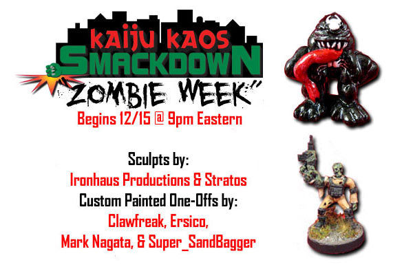 Continuing their run of themed releases in the build up to the Holidays, Bryan Borgman over at Bailey Records is proud to present “Zombie Week” in the world of Kaiju Kaos! Touching down in the Bailey Records store at 9pm Eastern tonight (12/15), the event is set to play host to a whole slew of undead mini figures, including Smackdown customs from Clawfreak, Mark Nagata, Ersico and Super Sandbagger, sculpts from Stratos and Ironhaus Pro, and new unpainted 28mm metal gaming miniatures. With prices ranging from just $2-$10 plus shipping, we suggest heading over early as these most certainly won’t be hanging around for long!
