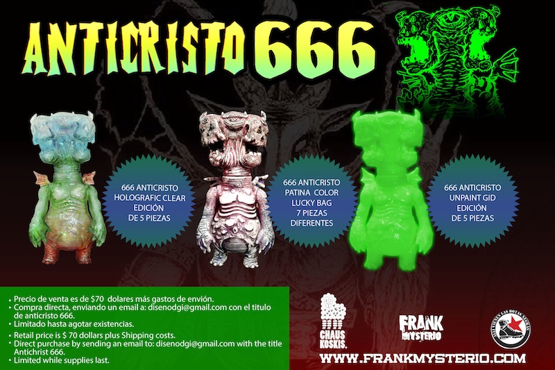 Frank Mysterio kindly shares details of his latest Anticristo 666 sofubi release, the “Vinatge” series! Once again featuring 3 very different designs, we have a clear version filled with strips of holographic glitter and sprayed in clear blue, green and red, a white casting with a random colour patina, and an unpainted GID. Currently available in strictly limited quantities for just $70 each plus shipping, anyone interested in picking one up is going to need to e-mail Mysterio directly at disenodgi@gmail.com with their details and desired figure (Holografic Clear, Patina Color, Unpainted GID)…