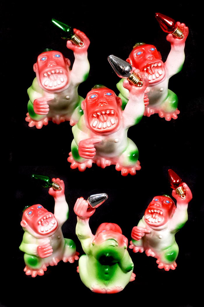 The guys over at Monstrehero come with a special holiday release of their Finger5 sofubi micro MonstreApe, the “Jingle Ape” edition! Seeing the Fig-Lab finger puppet’s first Monstrehero-painted run, the 3″ figures come with a variety of festive green, red, and silver sprays on white soft vinyl, complete with a random metallic Christmas ornament inserted in the hand. Currently up for grabs in the Monstrehero store right here, the Jingle Apes have been priced at just $25 each plus shipping…