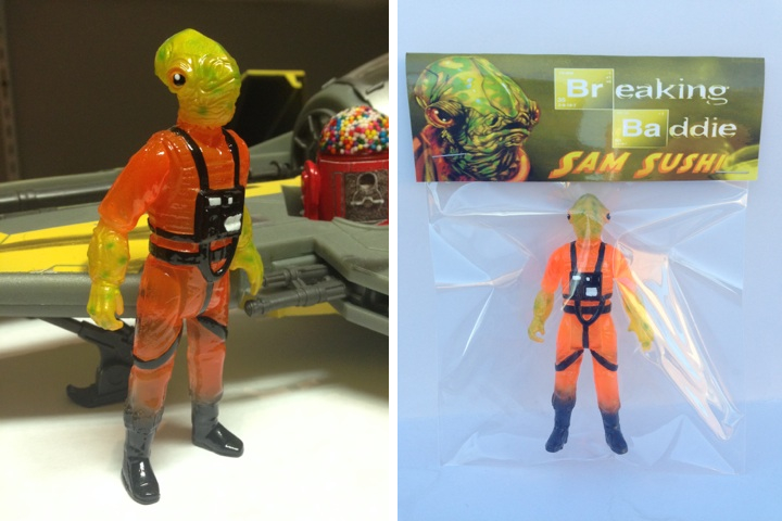 Mike Woods over at Falcon Toys has just revealed the latest addition to the ever growing family of Breaking Baddie custom bootlegs, ace pilot treasure hunter Sam Sushi! Traveling the galaxy as a space age Indiana Jones, the adventure seeking ladies man has been kit-bashed from a selection of vintage 3.75″ figures, coming cast in a clear resin with stunning clear orange/yellow sprays and black hand painted detailing. Dropping in the Falcon Toys store this Friday, January 3rd at 5pm Central time, this first wave has been limited to 5 (including a “Pink Thing” chase!), coming bagged and headed for just $35 each plus shipping…