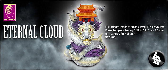 Revealed last week in all it’s painted glory, RESTORE’s first edition Eternal Cloud will be up for pre-order at Lulubell Toys next Monday, January 13th! Standing at around 9″ tall, the amazingly detailed piece has been cast in a light grey soft vinyl with purple and cream sprays, coming complete with an orange resin shrine and red horns. Priced at just $120 plus shipping, the made to order piece will be available until January 30th- so be sure to head over and grab yours ASAP to avoid disappointment!