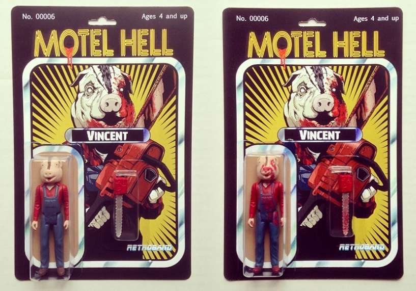 Aaron Moreno over at Retroband has worked his magic on yet another cult 80’s horror classic, transforming Motel Hell’s pig-headed Vincent into a fully fledged action figure! Created for Clutter‘s upcoming (In)Action Figure 2 group show, the stunningly executed piece features a kit-bashed and re-sculpted 3.75″ resin figure, pig mask and chainsaw accessory- all wrapped up in a beautifully realised blister backer from Worthy Enemies! Pricing and edition size are still closely guarded at the moment (although we can confirm that a “Battle Damaged” chase will be making an appearance!), so to be in with a chance of bagging one, we suggest signing up to Clutter’s preview list right here for first dibs…