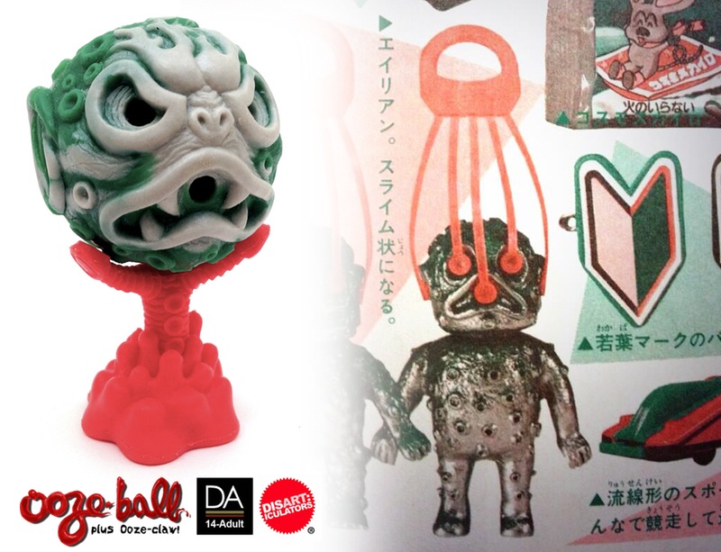 With the launch of the Disarticulators‘ Ooze-Claw display stand in just a couple of days time, we’ve decided to unveil one of the many surprises that’ll be accompanying the drop… the “Cosmos Alien” Ooze set! Taking direct inspiration from the original Cosmos Alien (Ooze-It gachapon bootleg) print ad, the Ooze-Ball has been cast in a similar dark green with a silver marble, whilst the Claw has been treated to a solid orangey red that matches the plug accessory. Limited to an edition of just 5 this time around, each set is due to come packed with an exclusive Cosmos header for $40 plus shipping. Look out for them alongside the Claws this Wednesday, January 15th at 9pm London time in the Man-E-Toys store!