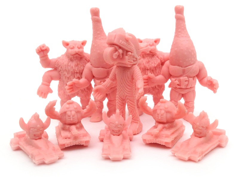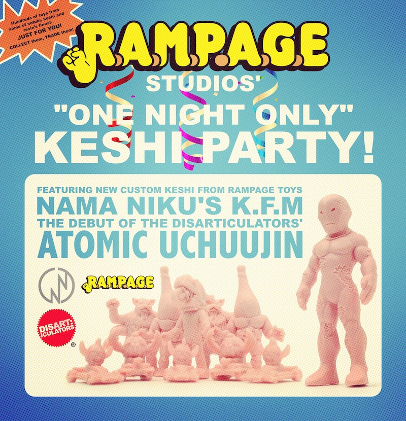 Following our announcement of the “One Night Only” Keshi Party over at Rampage Studios next Friday, we thought we’d share with you guys a few of the figures that’ll be making an appearance! Joining the previously revealed Catfighter keshi, Rampage Toys’ Jon Malmstedt has got to work on a trio of all-new bootlegs for the infamous Rampage gacha machine; the bike headed Otobai Man, plus micro 2 pack Robo Racer and Tank Titan, all 3 of which will be joined by a generous helping of the original Cupcake and Super Cupcake Luchas (not pictured). Also headed for the gacha comes the debut of the latest figure from Nama Niku, Kentucky Fried Muscle! Featuring a hilarious kit-bashed drumstick head plus Nama’s signature belt branding, the figure, along with all the above, is currently being produced by our very own Tru:Tek in a mix of vintage keshi red, blue and of course flesh… Stay tuned for further reveals throughout next week (including the debut of Atomic Uchuujin), plus a full show account from Tru:Tek next weekend!