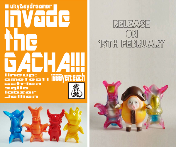 On top of the exclusive Lampu, Squilo and Lobzar that will be touching down in the Jungle store this Saturday, February 15th (find out more in our previous post right here), Uky Daydreamer have just revealed that they will be storming Akihabara’s One-Up with a whole heap of gachapon micros tomorrow! Created for the “Invade the Gacha!!!” mini show, unpainted versions of all 4 Uky Daydreamer micros, Octrion, Squilo, Lobzar and Jellien, will be up for grabs “blind bagged” in either blue, orange, red or yellow soft vinyl for just 1,000yen ($10) each. We’re still not sure if the figures will see an online release, but we’ll be keeping our fingers crossed for a similar “virtual gacha machine” as Rampage Toys’ recent Gachapon Goiblins release…