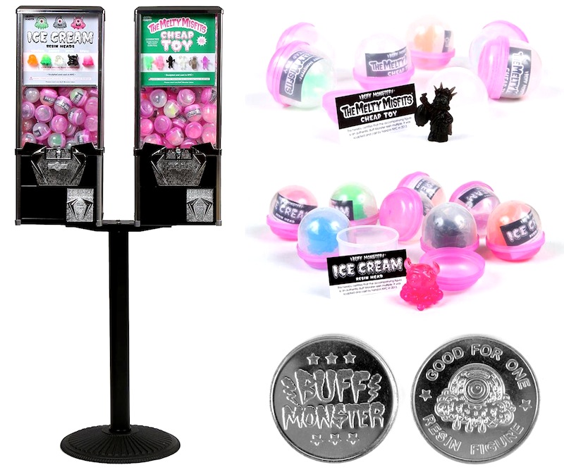 For the first time since their inception back in November, Buff Monster be offering the toys (and tokens!) from his toy machine online! Offered up in two different styles; Ice Cream Resin Heads and Melty Misfits Cheap Toys, the heads will be available in four main variations (Original, Zombie, Devil, Skull) and three rare variations (Split Devil/Zombie and 2 different Double Zombies), whilst the GPK inspired Cheap Toys will have three different designs up for grabs (the original Double Heather, plus toy the machine exclusive Graffiti Petey and Alice Island). Cast by Buff Monster himself, a number of different colourways will be on offer, including clears, opaques and a 1 in everhand paints. Up for grabs blind bagged alongside the original toy machine tokens for just $20 each, the online toy machine will be dropping in the Buff Monster store tomorrow (2/21) at 10am EST…