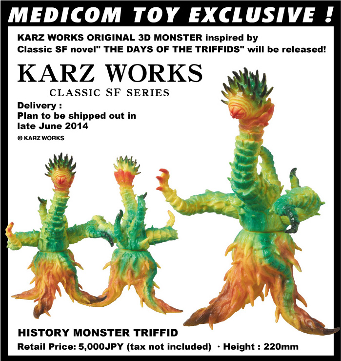 Karz Works have teamed up with Medicom Toy for the release of their latest figure, the breathtaking History Monster Triffid! The first release in Karz Works’ latest ongoing series, “Classic Sci-Fi”, the beast has been heavily inspired by John Wyndham’s cult 1951 novel “Day of the Triffids”, resulting in one of the most unique looking pieces we’ve seen in a while. Standing at 22cm (8.5″) tall, the figure has been cast up in a yellow soft vinyl for the release, complete with green, brown and red sprays. Thankfully available worldwide this time around, the History Monster Triffid can be found in the Medicom Toy store right here until the end of March for just 5,000yen ($49) plus shipping…