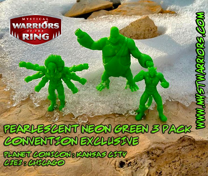Coming just in time for St Patricks Day, the guys over at Fantastic Plastic have just revealed the latest Mystical Warriors of the Ring colourway, a “Convention Exclusive” Pearlescent Neon Green! Featuring all 3 designs from the original factory produced line up, the injection moulded PVC mini figures will be up for grabs at both the KC Planet Comicon (True Cast Studio Booth 330) between March 14th-16th, and Chicago’s C2E2 (Nerd City Booth 750 in “THE BLOCK”) between April 25th-27th, coming in at just $9 per set. In addition to the figures, the guys have also confirmed that they will be displaying a number of other upcoming items at both cons, including a life sized AWF Championship Belt, a prototype of the AWF Playmat, a new Graphic Novel anthology, plus a few other surprises for lucky attendees! Keep track of any further developments on the Mystical Warriors blog right here…