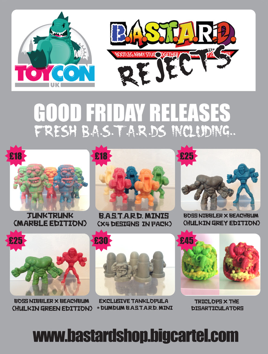 Yet more from the guys over at Triclops Studio today, as the duo proudly present their Good Friday B.A.S.T.A.R.D Sale! Featuring a whole slew of new figures that were previously unveiled at ToyCon UK last weekend, the huge line-up includes Hulkin “Green” and “Grey” Boss Nibbler sets, the debut of full sized B.A.S.T.A.R.D “Junk Trunk”, new mini B.A.S.T.A.R.D 4 packs, Tanklopula “Hot Pink” artist proofs with DumDum companion, plus the big one… the Triclops x Disarticulator Rotten Tomato in a stunning “Green Meanie” colourway! Up for grabs in the B.A.S.T.A.R.D store right here later today (4/18), we suggest keeping a close eye on both Luc and Rob Clops’ IG feeds for an exact drop time in the next few hours…