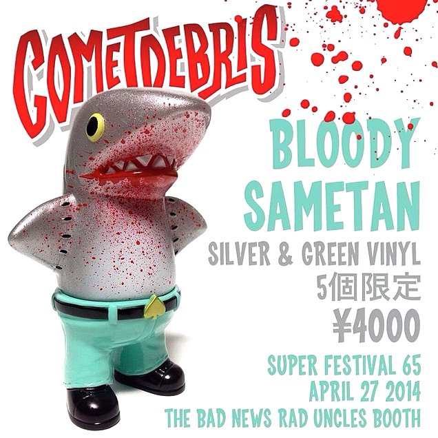 With Superfestival 65 just around the corner, Koji Harmon over at Comet Debris has just revealed the first of a number of exclusives he’ll have on offer, proudly presenting the Bloody Sametan! Cast in a mix of silver and light green soft vinyl, the 4″ figure has been decked out in a number of black, yellow and gold masked sprays, finished off with an ample blood splatter around the mouth. Priced at just 4,000yen ($39) each, the Bloody Sametans will be available exclusively at the Bad News Rad Uncles booth this Sunday, April 27th…