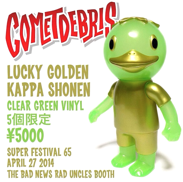Joining the previously posted Bloody Sametan micro run, Koji Harmon over at Comet Debris proudly present the second exclusive figure he’ll be bringing along to Superfestival 65 this Sunday… the “Lucky Golden” Kappa Shonen! Once again limited to just 5 figures, Kappa has been cast in the same clear green as the recent ToyCon UK release, this time around with a mix of gold and black masked sprays. Priced at 5,000yen ($49) each, the figures will be available at the Bad News Rad Uncles booth…