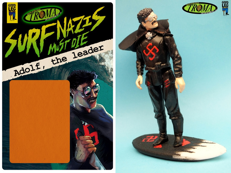 Securing yet another massive license from the world of cult horror, the guys over at Goodleg Toys have teamed up with Troma Entertainment for the release of the first official Surf Nazis Must Die action figure! Based on the film’s super-villain Adolf, the 3.75″ resin figure comes 100% hand made and painted, replete with 5 points of articulation, hand cut cape and surfboard accessory courtesy of FonkyFinger Fingerboards. Limited to an edition of 35 pieces, each coming backed with card art from Pablo Perra and Ralph Niese, preorders for the figure will commence today (4/30) at 11pm GMT+1 over at the Goodleg store. Pricing is still to be confirmed…