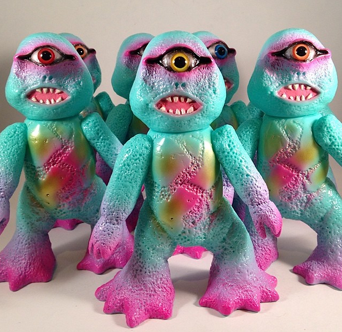 Joining Splurrt‘s “Arctic” Geros (full details here) as part of SLAVExONE‘s May Madness releases, D-Lux has just been revealed as the latest artist to take on the crazy looking cycloptic beastie! Once again limited to a micro-run of just 6 figures, the 6.5″ tall Gero has been cast in a gorgeous Tiffany-blue soft vinyl, coming with contrasting neon Mad Ape Ninja sprays and finished with unique coloured dolls eye inserts. Due to be making an appearance in the D-Lux store on Saturday, May 17th (time TBC), expect to pay around $75 each plus shipping…