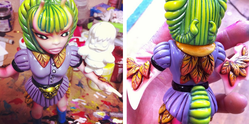 Joining the ton of figures we’ve featured over the past couple of days, Jon over at Rampage Toys is proud to present another pair of Design Fiesta exclusives that are going to leave overseas collectors positively green with envy… a one-off custom Mockpilot and a Chibi Jinx micro-run! One of the first artists to be given the honour of painting up Paul Kaiju‘s new figures, Jon certainly doesn’t disappoint with these- the 7″ tall pilot coming in a tight blend of lilac, flesh, blue and neon green sprays with a mind-bending array of highlights, washes and hand painted detailing, whilst the batch of 9 Chibis have each been treated to their own unique paint app, ranging from the signature Rampage neons through to more classically inspired palettes… Going on sale at the Rampage Toys x Fig-Lab x Refreshment booth (E167/168) this Saturday, May 17th, we would say to look out for any leftovers online next Monday, but we all know that’s just wishful thinking!