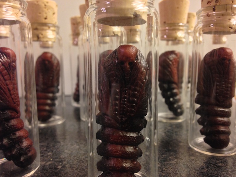 Quickly gaining notoriety through his monstrous selection of handcrafted collectibles, toys and resin kits, Josh Hardie over at CreatureKits is proud to present arguably his most gruesome creation yet, speciMAN Stage 1! A disturbing mix of caterpillar and man, the partially hatched cocoon has been hand sculpted by the artist, standing at around 2.25″ tall. Cast in resin and painted in a suitably grim blend of crimson red and black washes, the figure comes housed in a 4″ glass specimen tube with removable cork. Limited to an edition of 18, speciMAN Stage 1 can be found in the CreatureKits store right here for just $36 plus shipping… Here’s hoping Stage 2 can match this little guy’s creepiness!