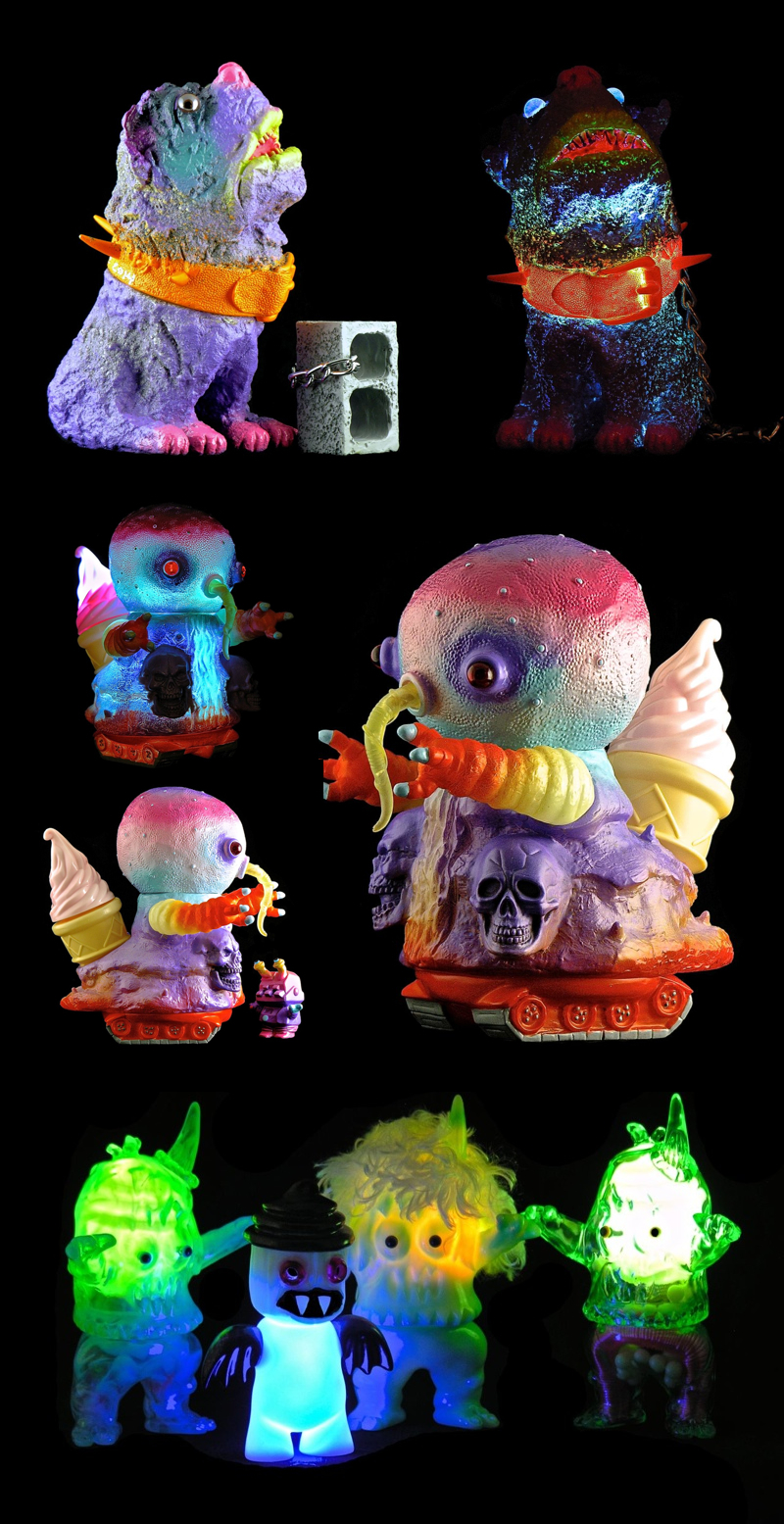 With the previously announced collaborative show with Elegab little over a week away now, Bob Conge aka Plaseebo has just unveiled a number of different customs he’ll have on display! Joining a one-off “Blue Moon” Warui Inu and a whole crew of LED infused Ugly Unicorns, the focal point has got to be the ominously titled Ghost Catcher- a one of a kind custom vinyl mash-up of an Elegab Kouzira and a Plaseebo Night Gamer that’s been fitted with glass eyes and a whopping 3 internal LED units! Opening it’s doors at Tokyo’s Rampage Studios gallery space on Friday, May 30th at 7pm, and running through ’till Sunday, June 1st, online sales for the show have been slated for the following Monday (time TBC). For those that haven’t already, head over to the Rampage blog here and sign up to the newsletter for first dibs on any leftovers before they head to the store…