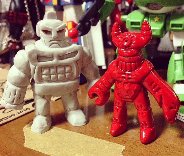 Taking a break from his wonderfully detailed resin action figures, Miso Mike over at the Omiso Factory has just revealed a pair of mini figures that should hopefully be up for grabs soon! Drawing inspiration from as far afield as Kinkeshi, Transformers, vintage kaiju and even MOTU, the super-chunky 2.5″ figures will presumably come in a classic monster vs robot style battle pack. With the salamander-armed kaiju guy already in the final stages of resin production, we’ll be keeping our fingers crossed for the first release in the coming weeks…