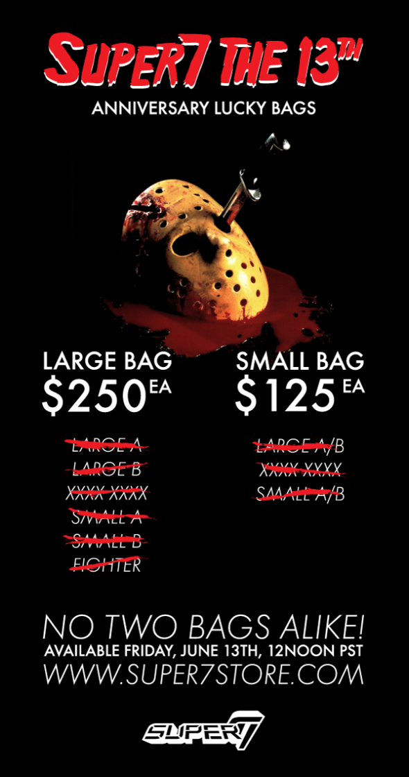 Super7 have revealed that they’ll be celebrating their Lucky 13th Anniversary with some KILLER Lucky Bags! Available in 2 different sizes, each box comes complete with a variety of limited edition pieces, including large, medium and small sized figures, unseen and unknown samples and tests, one-of-a-kind hand-painted custom pieces and other random rarities- with no two bags are alike! Up for grabs at $250 for the large (six figures) and $125 for small (3 figures), the bags will be touching down in the Super7 store on Friday, June 13th at Noon PST…