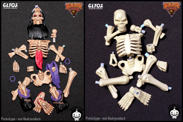 But that’s not all! As well as a whole barrage of potential stretch goals including Prince Lightstar, Talyn and Grimskull figures, OT are also offering up 2 other incentives for anyone still on the fence about taking the plunge- a standard Skeleton companion figure to Baron Dark in either bone or GID and a special Traveler Skeleden Glyos! Available for an additional $13 pledge each, head over here to take a closer look pair…