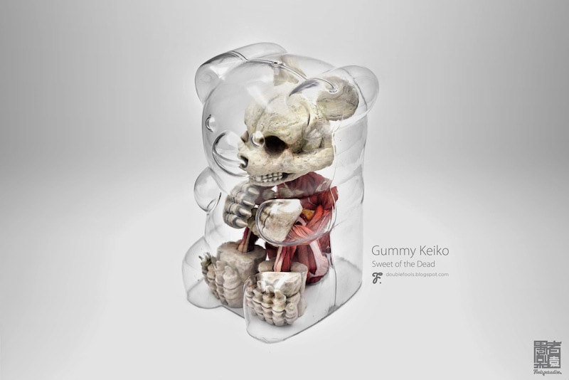 Joining the recent online release of the J.P.Toys exclusive “Confessions” set, Fools Paradise have just revealed another all-new creation, Gummy Keiko: Sweet of the Dead! Whilst borrowing a little too heavily from Jason Freeney’s Gummi Bear Anatomy design (check it here) for our comfort, there’s no denying the time and attention to detail that’s gone into the 6″ tall piece- the completely re-sculpted, anatomical Keiko, the crystal clear, PVC cast gummy bear dome and the stunning paint work simply oozes quality that’s rarely matched in the resin art toy scene. Available via preorder through the Fools Paradise blog here until July 11th, Gummy Keiko can be yours for $239 shipped worldwide…