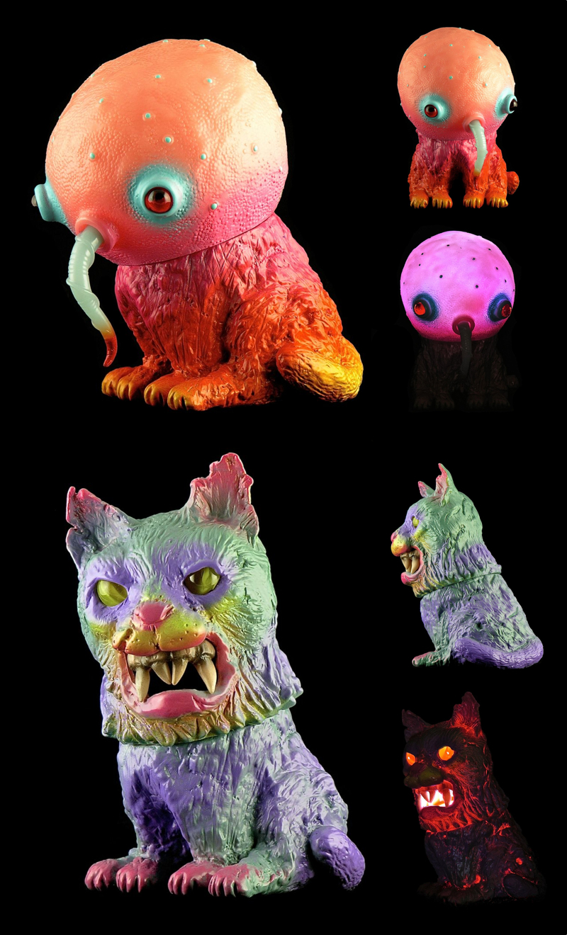 Bob Conge aka Plaseebo kindly shares 2 of his custom creations for Max Toy Co‘s upcoming Tokyo Cat Fight show, Wereneko and the Neko Night Gamer! Utilising the Kaiju Coup “Warui Neko” soft vinyl platform, the pair of of one-off pieces both come with fitted custom glass eyes and internal, motion activated LED units- fitted in the head of the Night Gamer, and the inset fangs of the Wereneko. Making an appearance alongside a whole host of other cat-based customs at the show on 5th-6th July at the Design Fiesta Gallery in Harajuku, Tokyo, pricing on the duo is still to be confirmed…