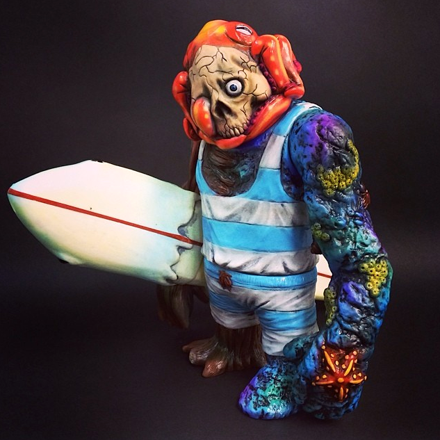 Making its first appearance as a near-finished clay proto back in March, we can now reveal that Kenth Toy Works‘ collaboration with The SIX F, the jaw-dropping Naminori Kaijin “Oron”, is finally ready for it’s first release! Standing at a lofty 8″ (11″ with shark-board!), the undead surfer features one of the most interestingly detailed sculpts we’ve seen all year, coupling drift wood, coral and octopi textures to dazzling effect. Making it’s debut in the full colour, hand sprayed edition you see above, Oron will be up for grabs via e-mail lottery starting July 4th at midnight Japan time, coming in at just 12,000yen ($118) plus shipping. Interested parties are going to need to fire over their name, address, Paypal address and telephone number to ktw.order@gmail.com before the close on July 11th- good luck to all who enter!