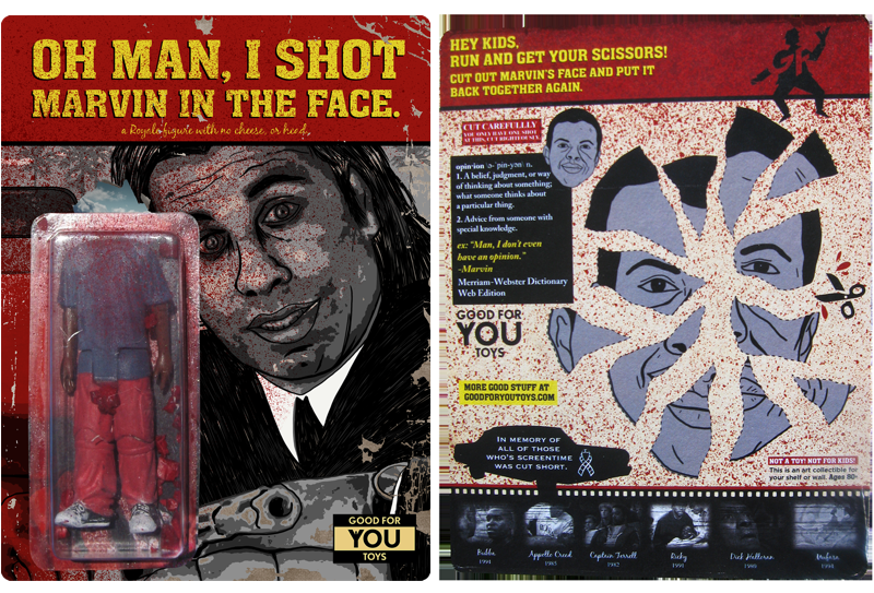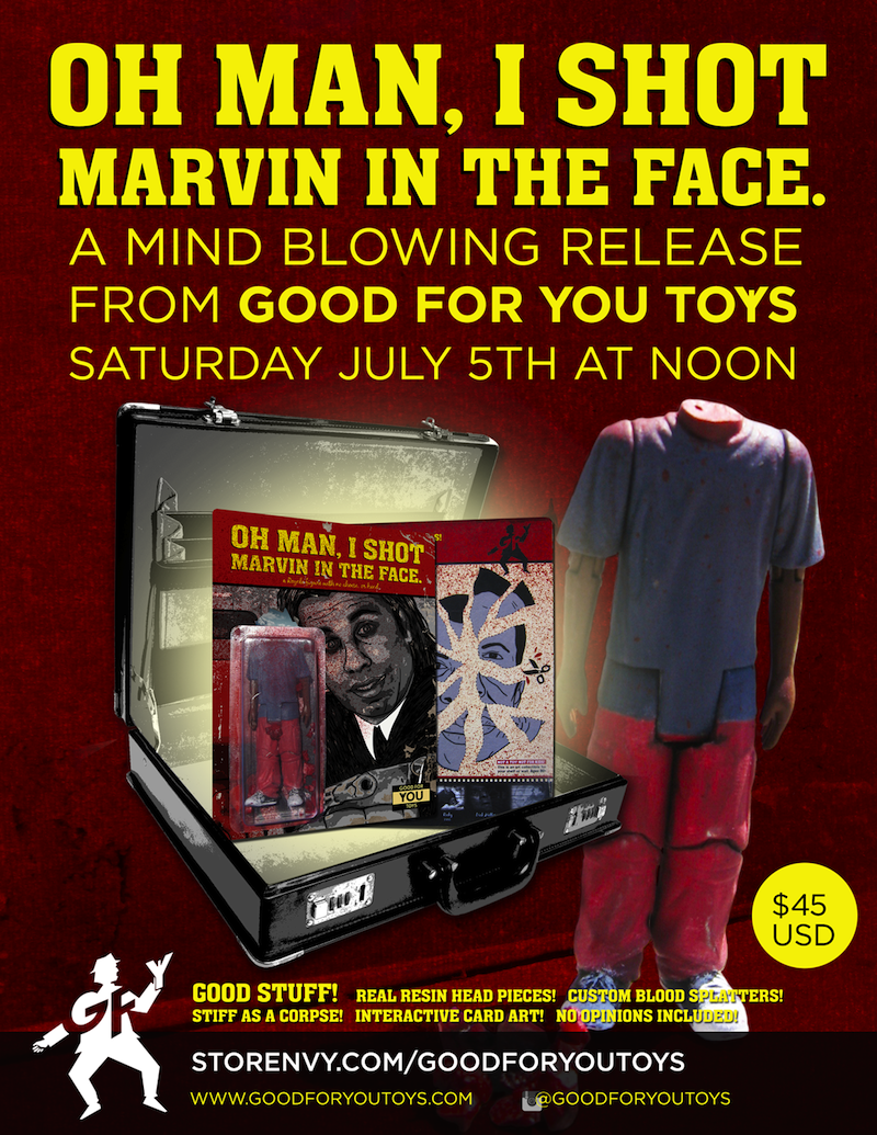 In a bizarre twist today, we bring you the second (albeit unofficial) action figure based on one of Pulp Fiction’s many colourful side characters, presenting the fateful “Marvin” from all-new imprint Good For You Toys! Coming fresh out of the trunk, each custom bootleg figure has been cast in resin and hand painted by the team at GFYT, complete 6 points of “unarticulation”, hand smashed head chunks, custom blood splatters and some hilarious “interactive” card art. Currently available to preorder through the Good For You Toys store right here, Marvin can be yours for just $45 shipped in the US…