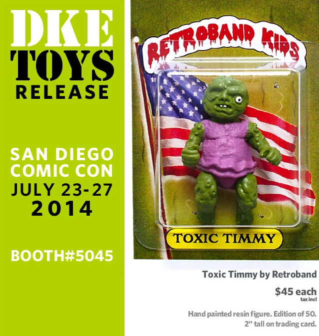 DKE Toys have just revealed yet another must-have exclusive they’ll be bringing along to SDCC on July 23rd, the Toxic Timmy mini figure from Aaron Moreno aka Retroband! Inspired by his recent “Crawling Dead” TAG Gallery submission of the same name, this 2″ tall mini interpretation of the radioactive mutant is due to be the first figure in the artist’s all-new upcoming series, Retroband Kids. Sculpted, cast and hand painted by Aaron, Toxic Timmy comes mounted on a on a traditional 2.5″ X 3.5″ trading card, featuring the original art on the front, plus additional back art from Gabriel Hernandez aka Worthy Enemies. Limited to just 50 pieces, Toxic Timmy will be available exclusively from DKE Toys’ SDCC booth (#5045) for $45 a piece…
