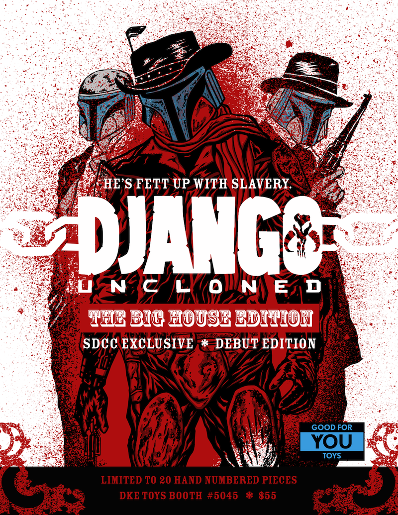 Wasting no time since the release of their debut figure “Marvin” last week, the guys over at Good For You Toys are proud to announce a hilarious new follow-up, D’jango Uncloned! Mashing up both (you guessed it!) Tarantino’s D’jango and Star Wars, the soon-to-be-revealed space cowboy is set to feature as part of DKE Toys’ humungous line-up of handmade SDCC exclusives later in the month. Stay tuned for the full lowdown from DKE over the next few days…