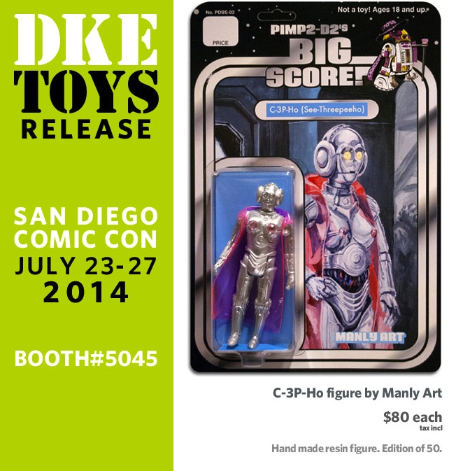 DKE Toys team up with Manly Art for yet another handmade-focussed SDCC exclusive, the C-3P-Ho resin action figure! A follow-up to MA’s controversial Pimp2-D2, the latest figure in the Big Score series stands at around 3.75″ tall with 5 points of articulation, coming hand cast in a silver resin with translucent pink vinyl cape. Limited to an edition of 50, each coming packed on a classic blistered back with art from MA, C-3P-Ho will be up for grabs at the DKE booth (#5045) for $80 each once the con doors open on July 23rd…