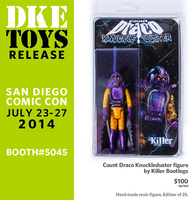 DKE Toys come with their second SDCC exclusive from Killer Bootlegs, proudly presenting the artist’s latest resin action figure… the jaw-dropping Count Draco Knuckleduster! Expertly kit-bashed and re-sculpted from a number of vintage toys, the 3.75″ figure has been hand cast in resin, coming complete with a beautifully detailed orange and purple paint scheme, an embedded chest plate, hand cut vinyl cape and retractable light sabre. Packed in a resealable clamshell with backer art from Michael York Gilreath aka Wizard Cleave, the Count has been limited to an edition of just 25 pieces priced at $100 each. Interested parties will be able to find the figure alongside a whole host of other handmade exclusives at the DKE SDCC booth (#5045) when the doors open next Wednesday, July 23rd…