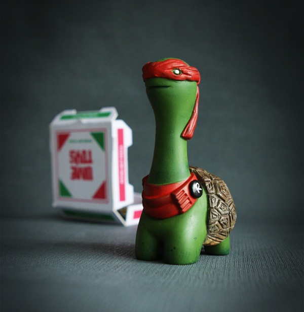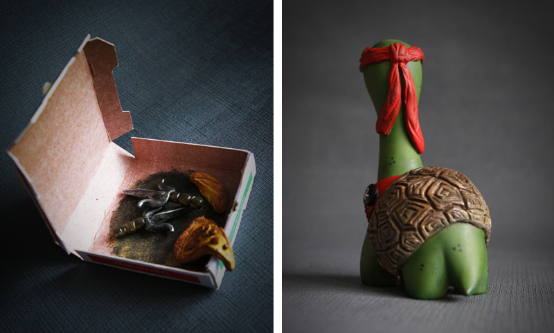 Richard Page over at UME Toys has just revealed his entry for the upcoming “Modified Wool” group show, proudly Raph in a Box! Taking on Chima Group’s adorable dino sofubi mini with ease, Rich’s TMNT inspired custom is brimming with tiny details, including a beautifully sculpted shell, cleverly redesigned belt/scarf, plus a hand cut, “grease” stained box complete with Raphael’s twin sai and a slice pizza! Touching down at London’s Ray Gun Comics this Saturday, July 26th between 4pm-7pm, Raph in a Box will be available alongside 29 other custom Wool figures from a selection of artist around the globe. Head over to the dedicated Facebook page here for more details on the event…
