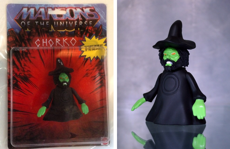 Having debuted at SDCC last week, Skinner is proud to reveal that the second figure in the ongoing “Mansons of the Universe” series, Eternia’s master of the black arts “CHORKO” will be touching down online later this week! Beautifully crafted by Healeymade utilising MOTU’s Orko alongside a modified version of Skinner’s Charlie Manson head sculpt, the 4″ tall figure has been cast in a sleek black resin complete with lime and orange hand painted detailing. Coming packed on an authentic MOTU style cardback, the black wizard will be available from the Critical Hit store this Friday, August 1st at Noon PST, coming in at $80 each plus shipping…