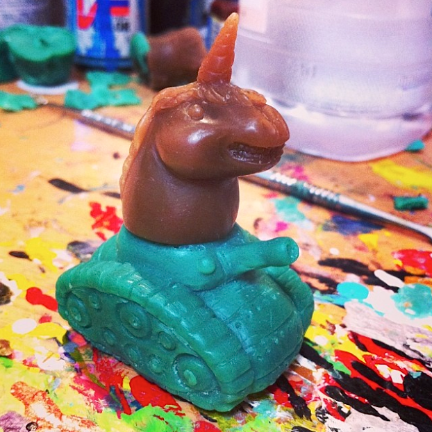 Following the announcement of the RAMPAGE KAIBUTSUYA series earlier in the week, Jon Malmstedt over at Rampage Toys has just revealed yet another new figure destined for soft vinyl soon- the Pea-Shooter Mobile! Fully compatible with the Gachapon Goblin micros (primarily the pictured Crazy Unicorn!), the 1″ tall figure has been hand sculpted by Jon, featuring a static turret with a removable top that can be replaced by the GG top halves. Already in the final stages of wax prototyping, we’re guessing the tiny tank will be making it’s debut at Superfestival and NYCC in just a couple of months time. Stay tuned for more info as soon as we hear anything!
