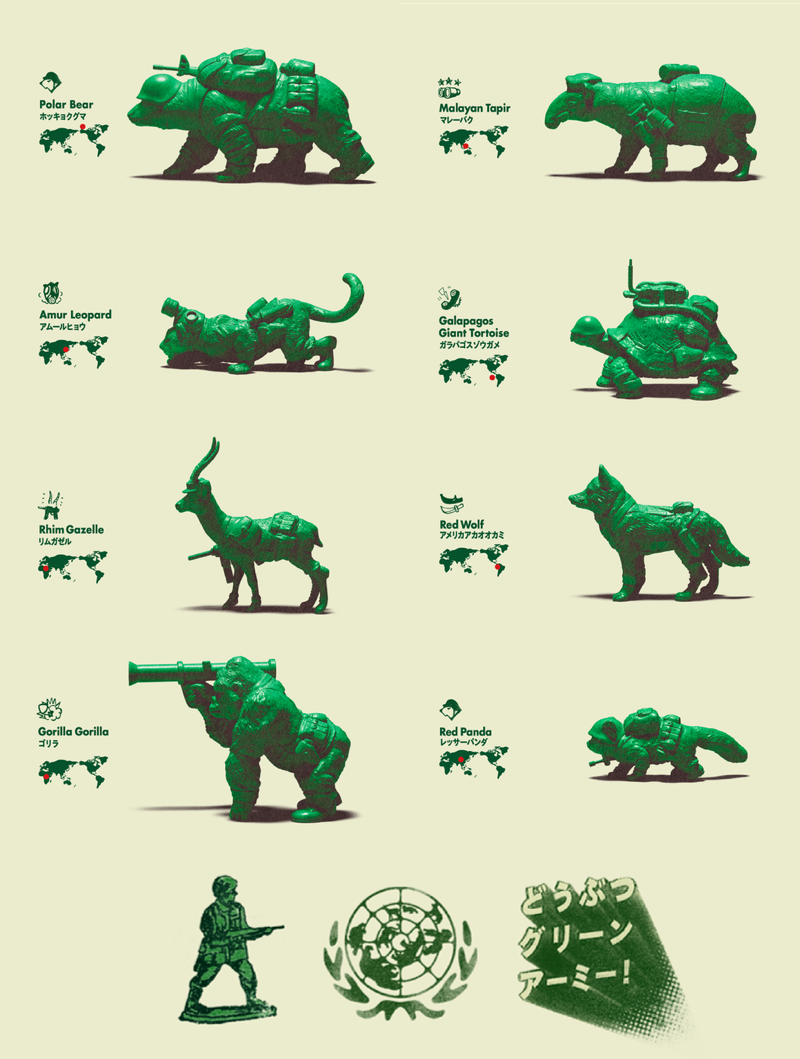 Recently spotted over at the Kaiju-Lab blog, the guys over at Chinese toy company Point Panda have just unveiled their latest run of gacha-style minis, the Green Green Army! Consisting of 8 of the world’s most endangered animals – from the Amur Leopard right through to the Red Panda – each “Green Army Man” style PVC figure has been beautifully sculpted in the 2″ keshi scale, decked out with thought provoking, WWII inspired attire, supplies and weapons and packed with their own propaganda-style mini poster. Due for release across Asia (presumably in capsule form) late August, the Green Green Army will set you back just 200yen ($2) a piece- here’s hoping we can get them over in the West at some point!