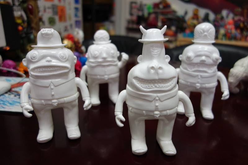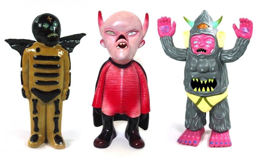 Having opened it’s doors during our brief break over the weekend, the leftovers from Toy Art Gallery‘s “Death Rides Again” group show are now available online! Featuring a plethora of awesome paintings, drawings and sculpture from trio Lurk, Double Parlour and Mike Egan, highlights include a number of one-off custom Bones “With Wings” mash-ups, plus the debut of TAG’s latest sofubi, Lurkfoot from Lurk (top right) and the Merryners from Double Parlour (below). With stock already disappearing quick, we suggest any interested parties should head over right here and check out what’s left before it’s all gone…