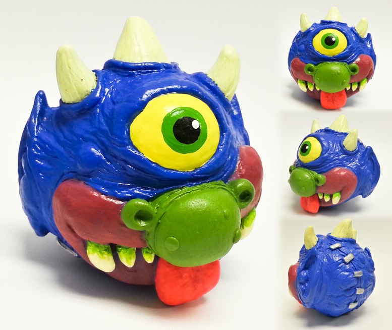 Originally teased here as a near finished sculpt a couple of weeks back, Motorbot‘s “My Pet Madball” resin has just been released in the Meathead store! Based on an illustration the artist created a couple of years back, the cycloptic beastie has been inspired by classic 80’s plush “My Pet Monster”, perfectly realised in 3D as an Madball-scaled, 3″ wide ball. Cast in solid resin, the figure has treated to a simple, flat paint job for this first run- which whilst in-keeping with the vintage Madball paint apps, is sadly lacking in the vivid hues of the original toy, or the detailed washes of Motorbot’s usual output. A minor flaw really, and one that both the impeccable concept and sculpt more than make up for… Residing in the store right here, My Pet Madball comes complete with handcuff display base (not pictured) for just $45 plus shipping… Here’s hoping for a blank run of these soon!