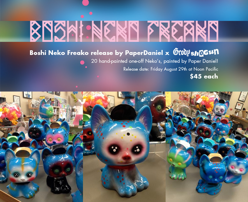 Boshi Neko Freako (top)- Artist Paper Daniel has taken on Grody Shogun‘s adorable mini sofubi “Boshi Neko” for the release of a super limited custom micro-run! Each coming uniquely hand painted by Daniel on a light blue soft vinyl base, the creepy-yet-cute kitties will be touching down in the Lulubell store this Friday, August 29th at Noon PST for just $45 each.